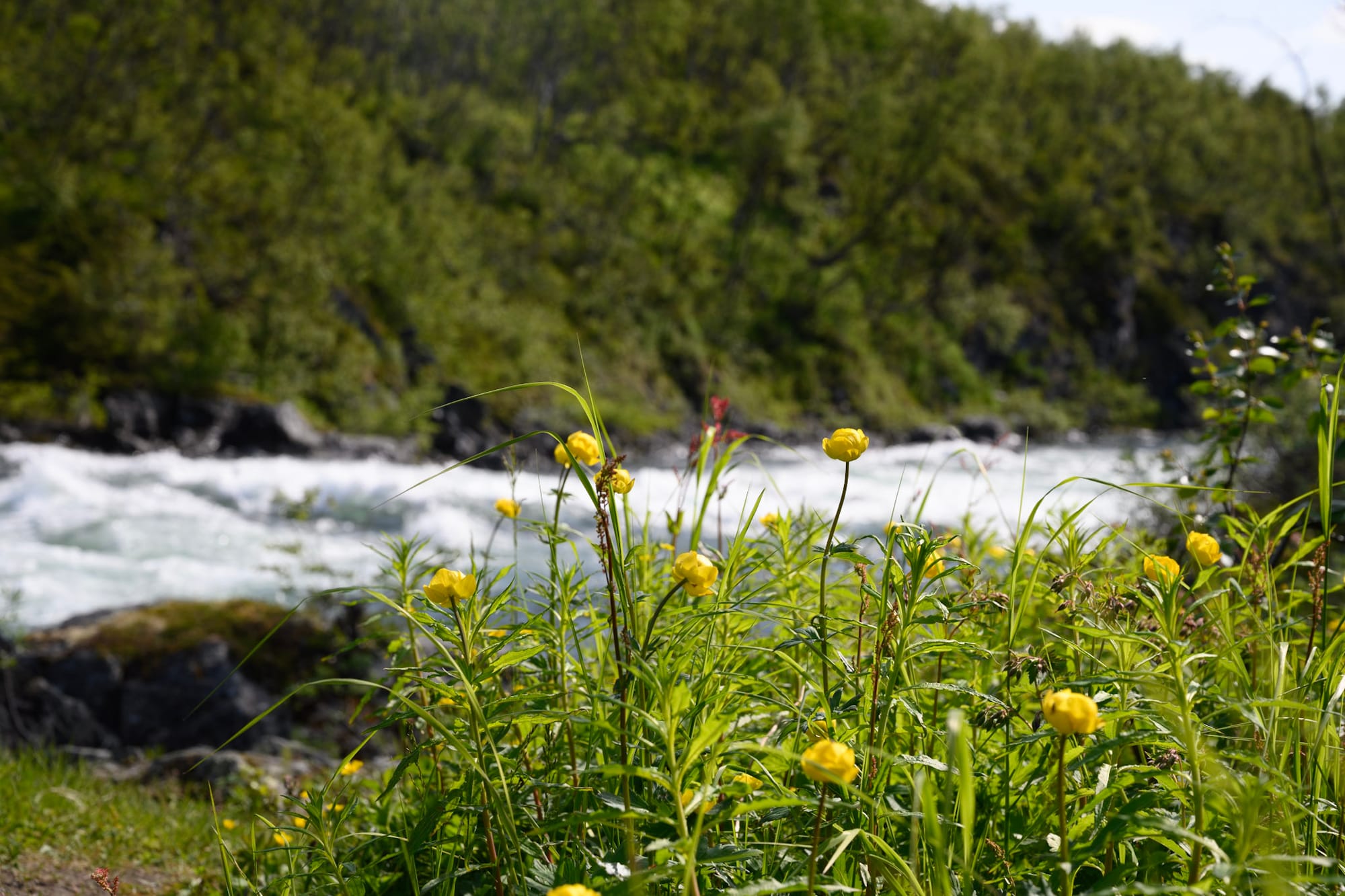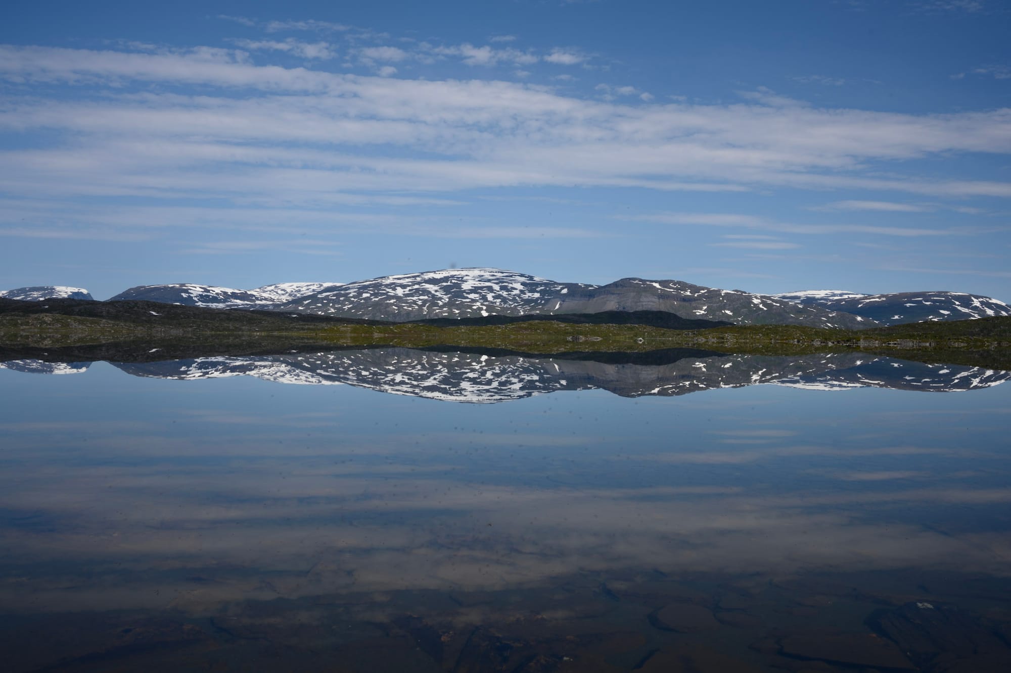 Am Auto verpflegen wir uns erstmal mit Zimtschnecken und verwerfen erneut den Gedanken, nach Abisko zu fahren, sondern nehmen direkt Kurs auf Norwegen. Die Straße schlängelt sich höher und höher durch die Berge, vorbei an weiteren spiegelglatten Seen und verschneiten Kuppen. In Riksgränsen halten wir an einem Supermarkt um ein Glas Moltebeerenmarmelade, ein Teilchen und zwei Kaffee - das letzte Mal zu moderaten schwedischen Preisen. Der Supermarkt ist klein, gerammelt voll und hat eine ganze Ecke voller outdoor-Krempel, vom Blasenpflaster bis zur Isomatte. Wie der Name schon ahnen lässt, stoßen wir kurz darauf auf den Grenzübergang, der sehr undramatisch und ohne Kontrollen vor sich geht. Der Grenzübergang ist gleichzeitig eine Passhöhe, die Straße durchquert ein weites Tal voll blank liegender, rundgeschliffener Granitfelsen, dazwischen Seen und hübsche, schwarzgestrichene Ferienhütten. Danach wird die Landschaft fast unmittelbar schroffer und dramatischer, hohe Berge ragen auf. Vor Narvik kommt zum ersten Mal das Meer in Sicht, wir wenden uns durch den Tunnel nach Norden und lassen den Abzweig auf die Vesteralen links liegen. Die Landschaft ist geprägt von dicht bewaldeten Hängen und immer wieder dem Blick zurück auf das Meer. An einem Rastplatz machen wir einige Fotos und erste Bekanntschaft mit einer als Biene getarnten Goldaugenbremse, die Sonne lacht und es ist mit über zwanzig Grad immer noch sehr warm, völlig verrückt.