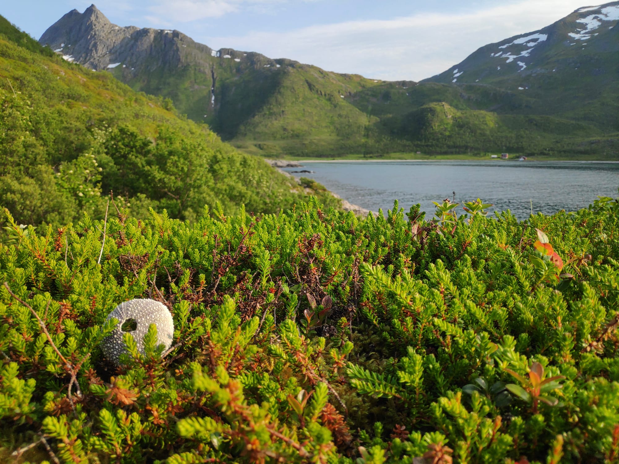 Als wir fertig gegessen haben, verziehen sich die Dunstwolken am Himmel etwas und die Landschaft strahlt in der Abendsonne auf, so dass wir den Pfad weiter richtung Strand erkunden und H., der zunächst die Kamera im Zelt lässt, den ersten Teil des Weges zweimal gehen muss, weil man in Norwegen einfach nirgends ohne seine Kamera hingehen kann! Die Sonne steht tief über den westlichen Bergen und sichtbare Lichtfinger fallen die Hänge hinab ins Meer; auf unserer Seite leuchten grellgrün Birken und Krähenbeerenheide. Immer wieder liegen federleichte Seeigelskelette im Moos, zerbrechlich in zarten Pastelltönen viele Meter über der Wasserlinie - wir verdächtigen zunächst stürmischen Seegang, später aber wird mir klar, dass eher Vögel die Übeltäter sein dürften.
