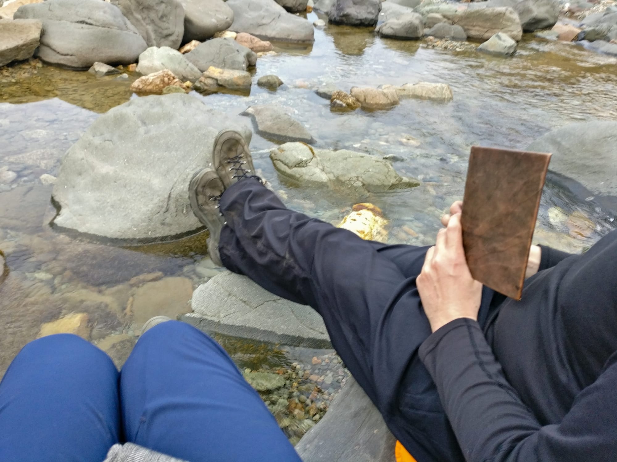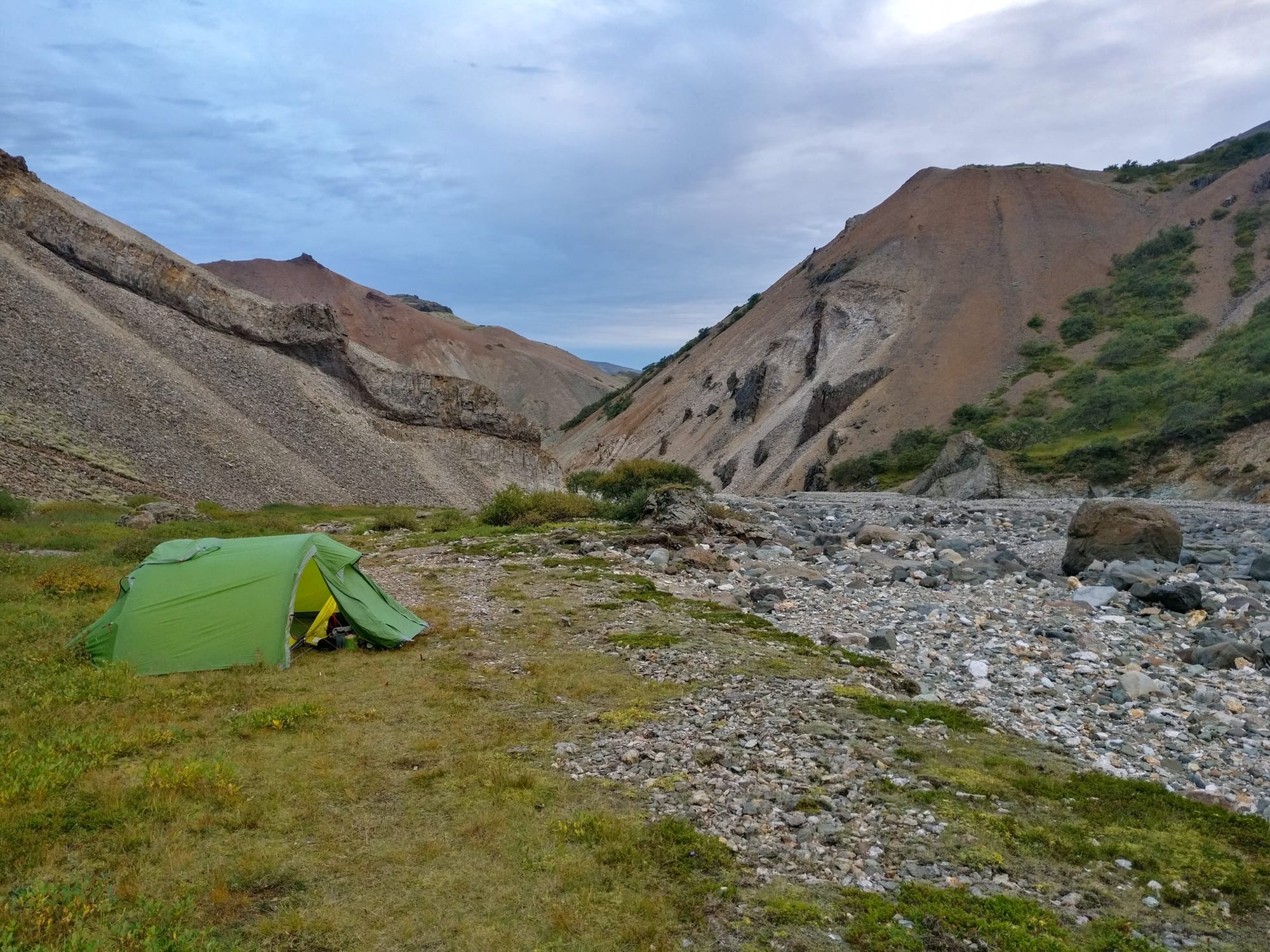 Die Idee, am Fluss in der Schlucht zu zelten, kommt auf und braucht nicht lange zum Reifen, so dass wir die Rucksäcke packen und zum zweiten Mal an diesem Tag den Weg durch die Schlucht nehmen. Die Grasflächen am Ende der Schlucht sind felsig, aber es ist kein Wind zu erwarten und so bringen wir das Zelt gut in der Nähe des Flusses zum Stehen, wo dann nach einer Schüssel Suppe vorm Zelt - das einzige Mal auf dieser Reise ist es warm genug, um vor dem Zelt zu essen - die Energie nicht einmal mehr für einen Drittelfilm ausreicht, bevor ich einschlafe.