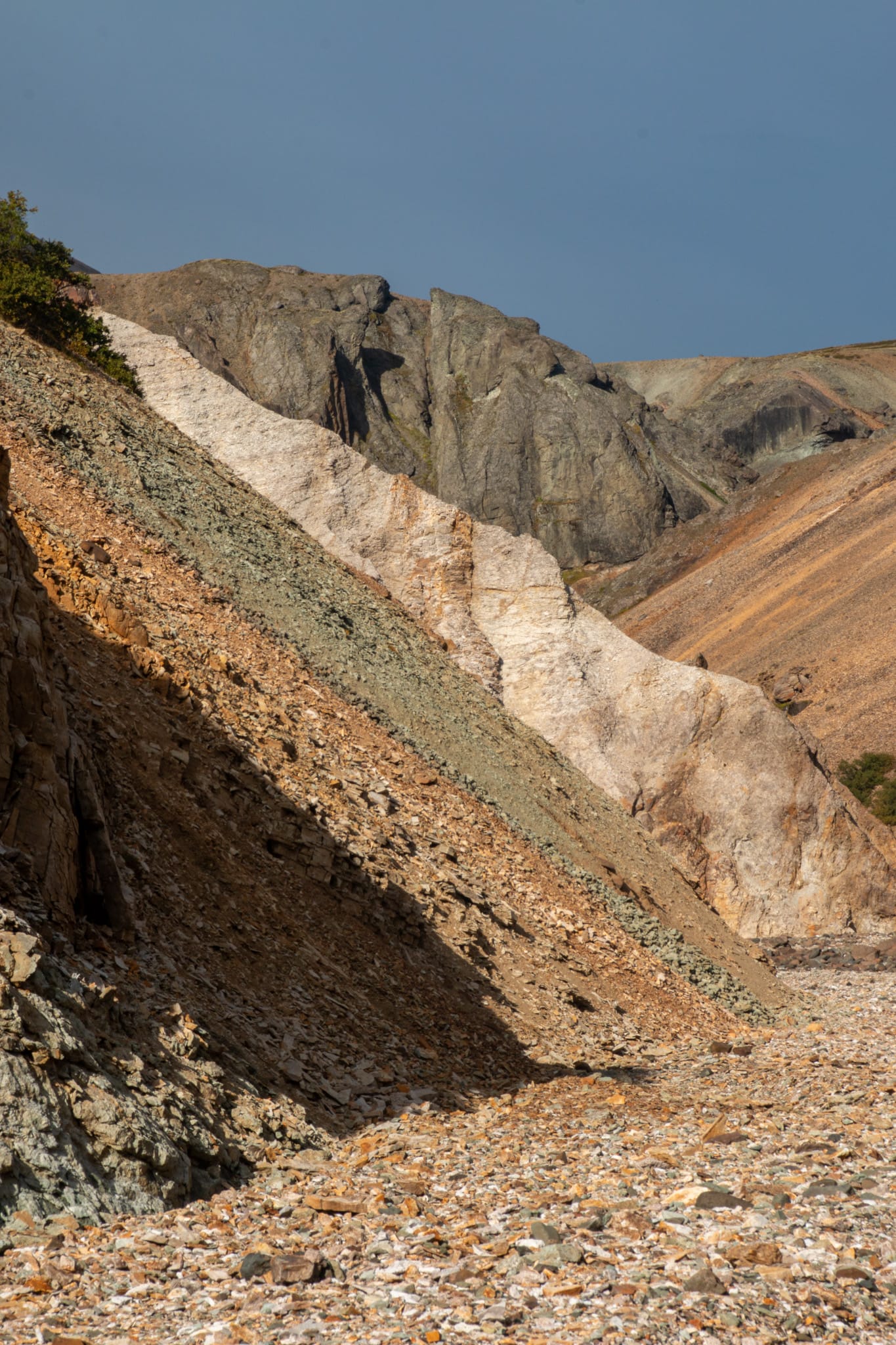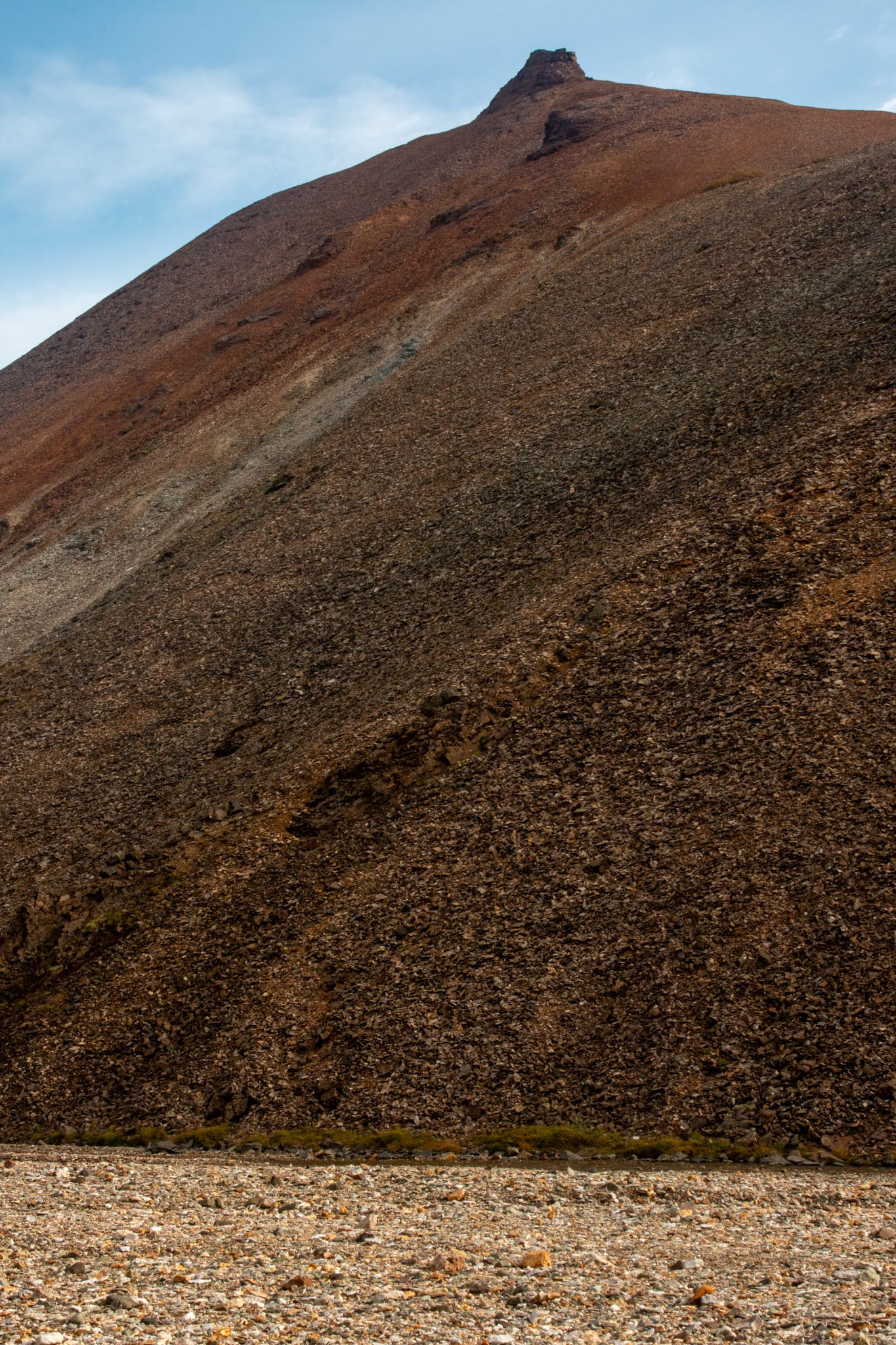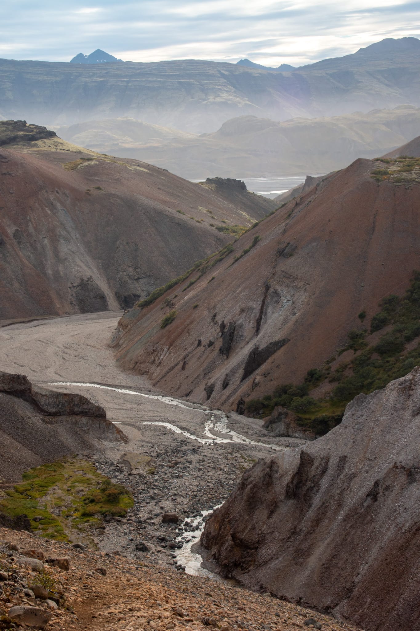 Auf dem Boden des Canyons fließt ein kleiner Bach, der immer wieder plötzlich unter das Geröll abtaucht. Die Steine klirren wie Tonscherben unter den Füßen. Es ist ein magischer Ort, ein ganz und gar überraschendes Stück Island, das keiner von uns hier erwartet hätte - ich dachte, dass es bunte Berge nur in Landmannalaugar gibt.