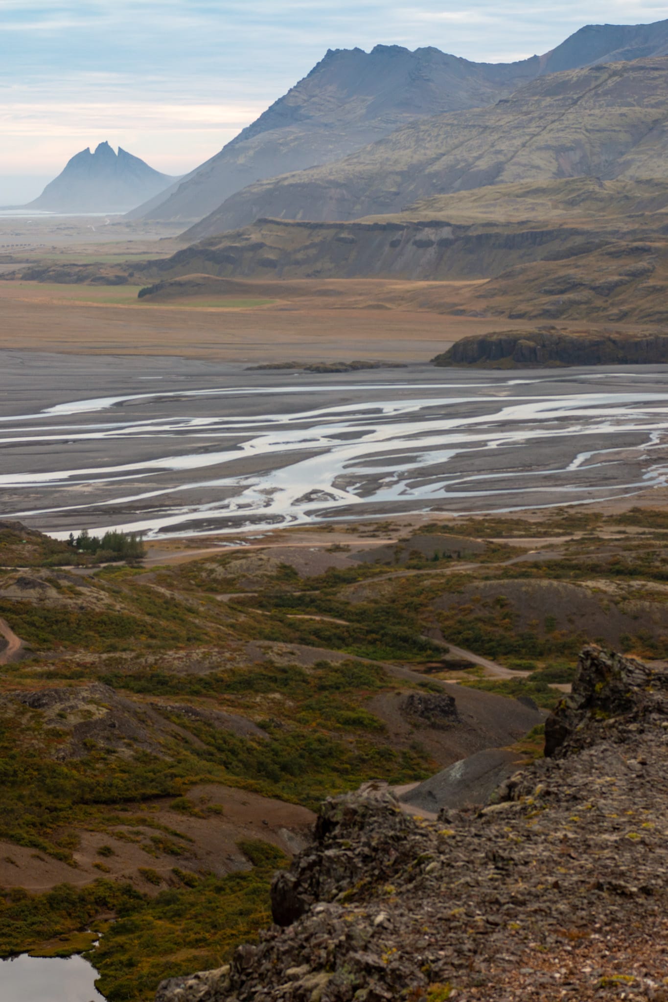 Nach einiger Zeit ist die Schlucht an einem Bachlauf zu Ende, ein steiler Pfad führt den Hang hinauf, jeder Schritt ein Klimpern, weite Ausblicke über die Schlucht bis hin zurück zum Gletscherfluss werden sichtbar. Oben auf dem Plateau die typische Hochheidelandschaft: Felsen, Flechten, Tümpel von Wollgras umstanden. Wir sehen ein Schneehuhn, das jämmerlich klingende Rufe von sich gibt.