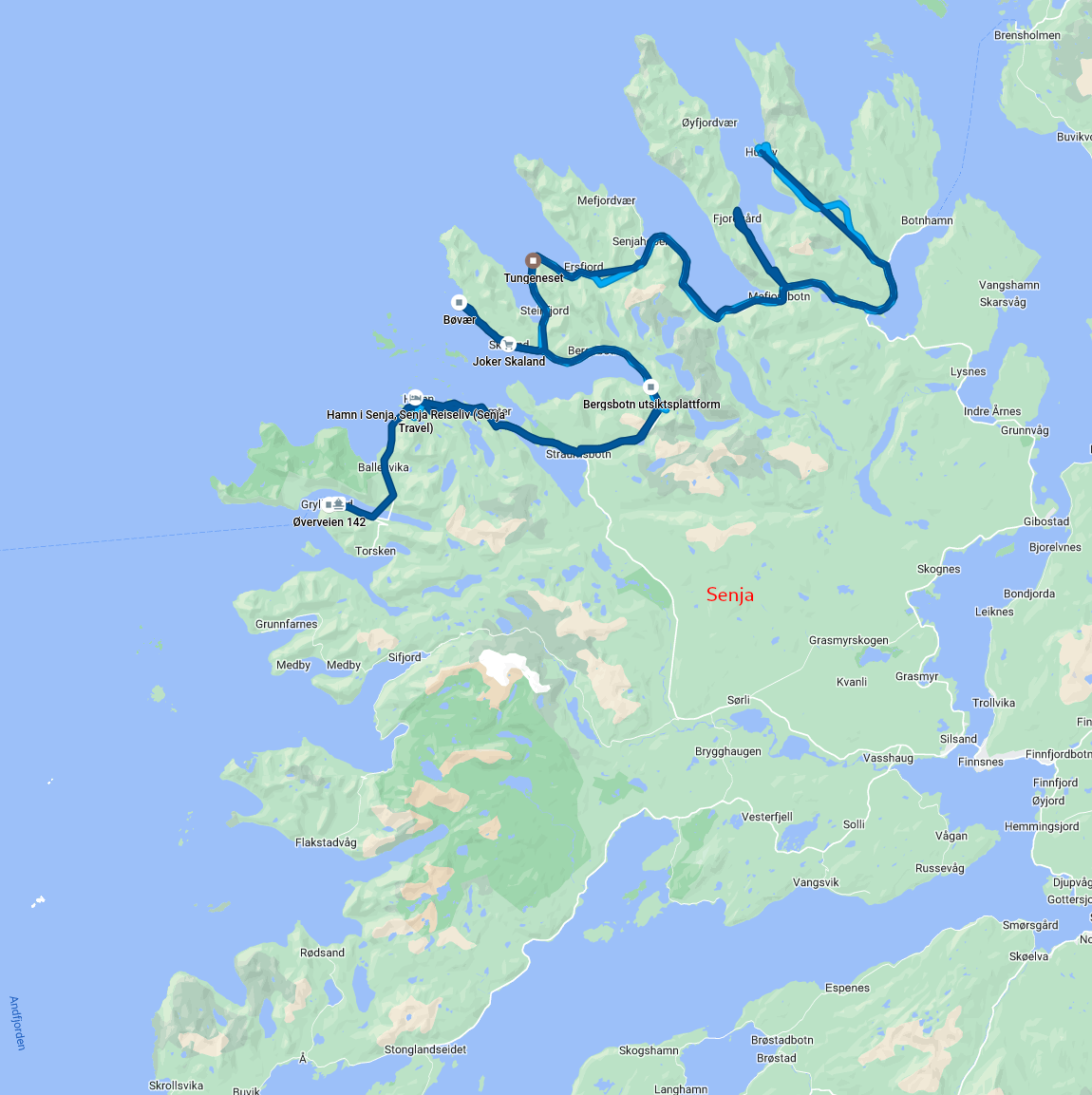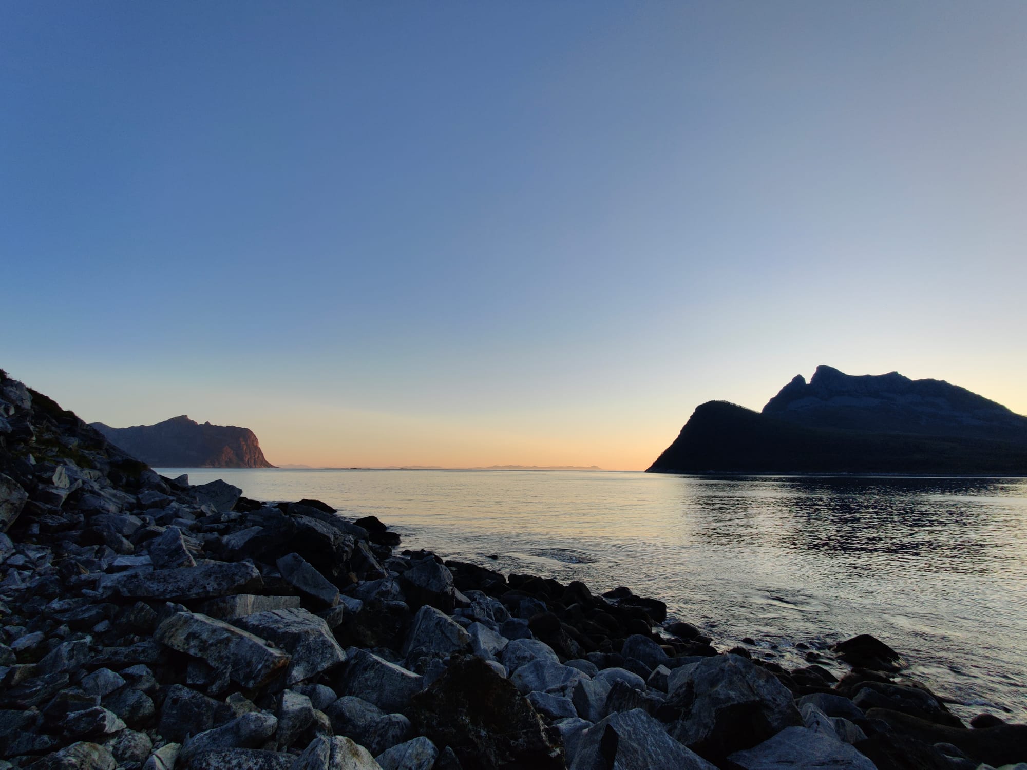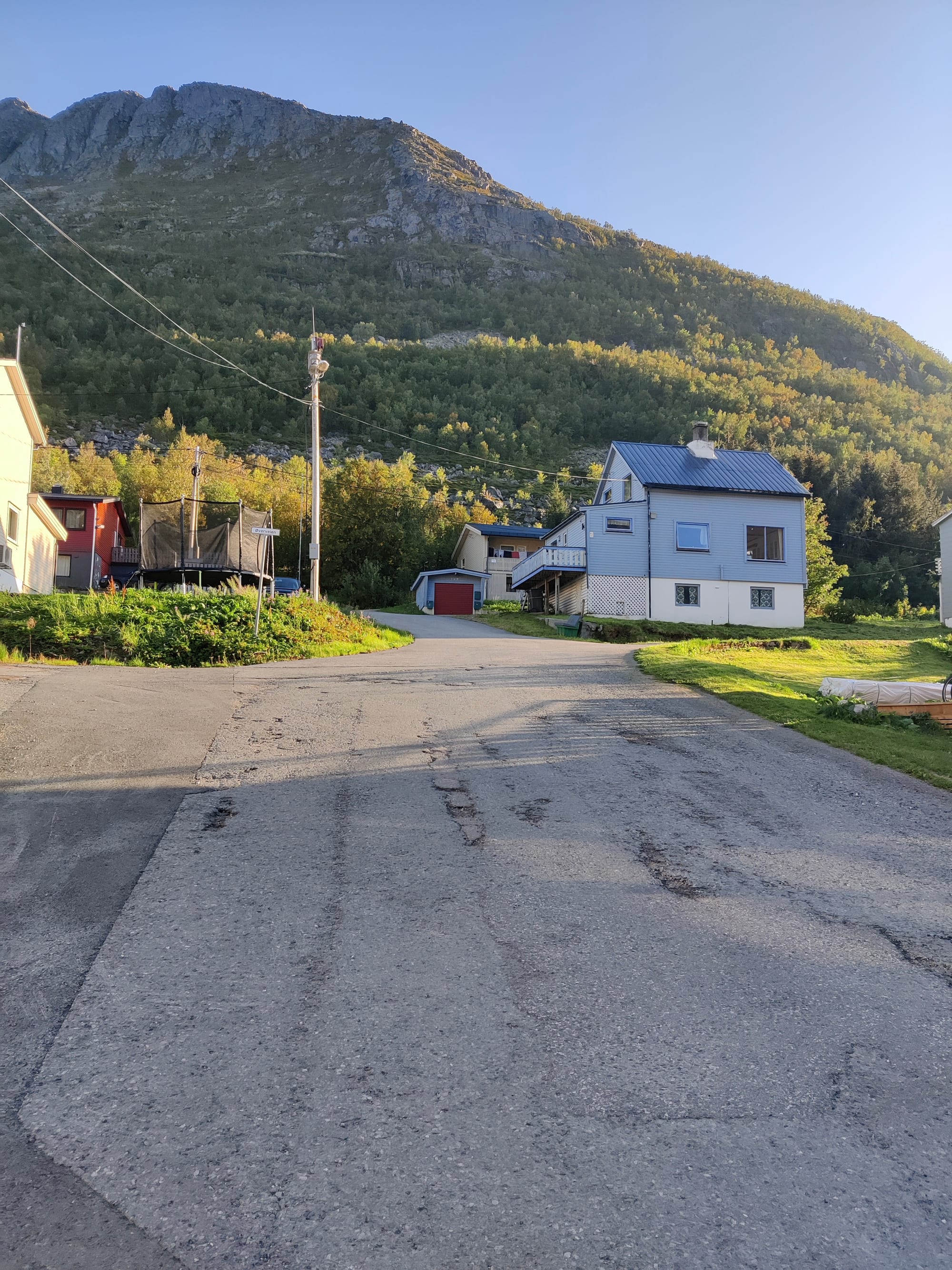 Beim Supermarkt in Skaland kaufen wir dann noch einmal Tiefkühlpizza fürs Abendessen ein und machen uns auf den Weg nach Gryllefjord, wo wir ein Ferienhaus gebucht haben. Viele Täler liegen jetzt schon tief im Schatten und es wird kühler.