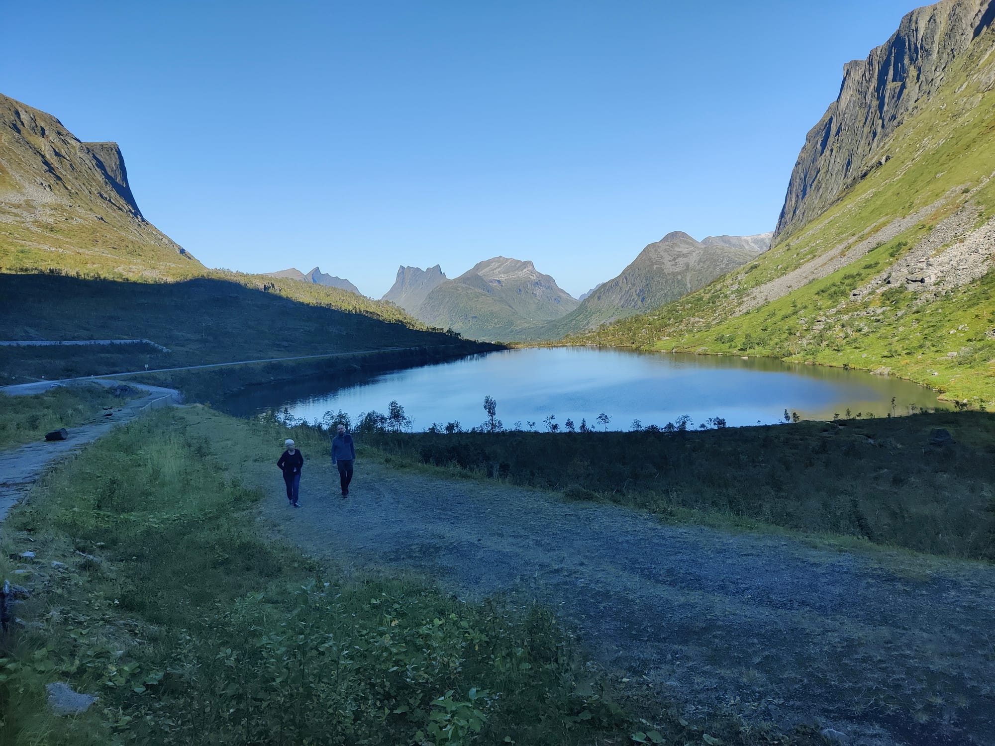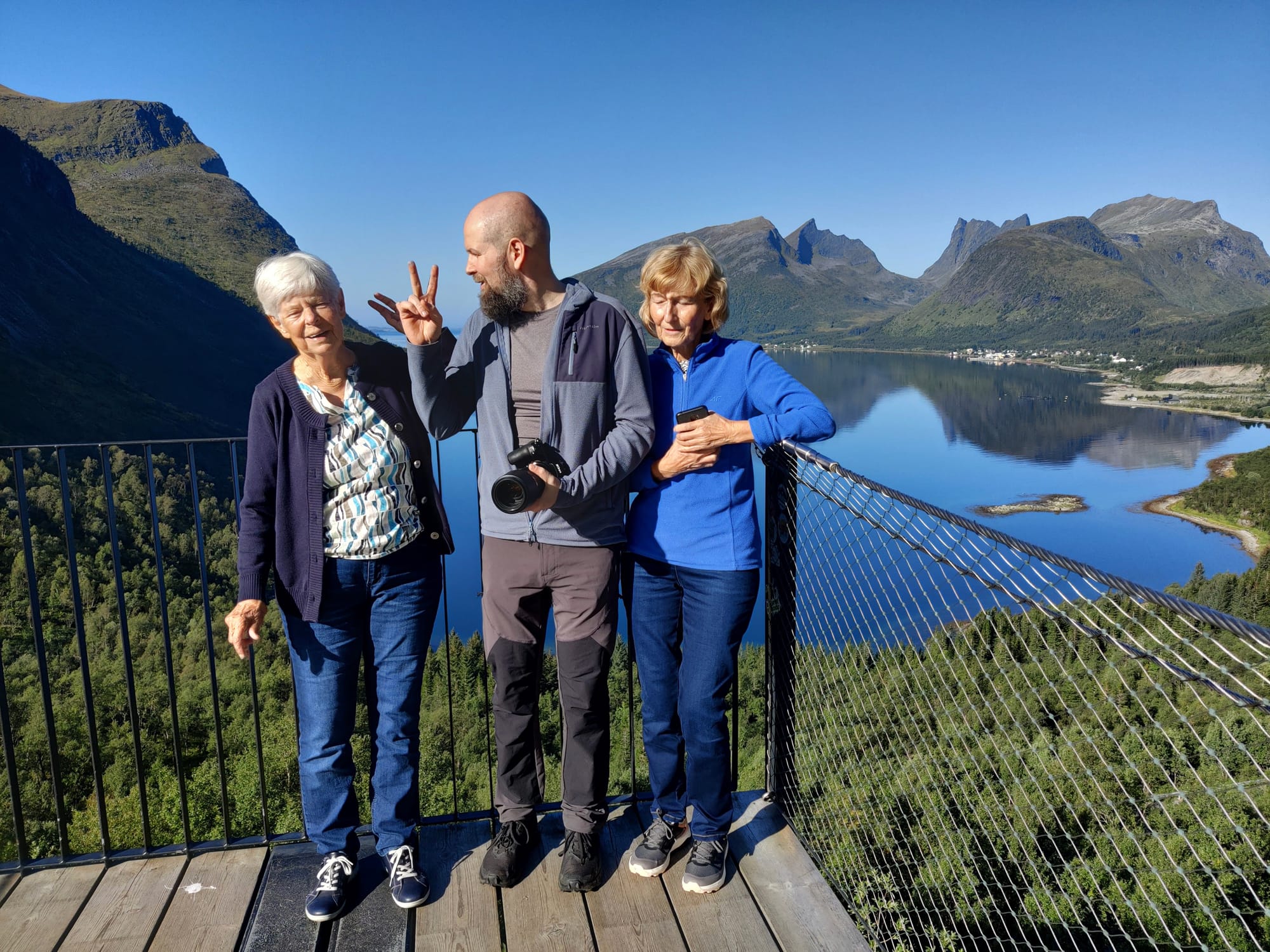 Die drei Wanderer gehen ein Stück den Sukkertoppen hinauf und zu einem Aussichtspunkt, von dem aus der Hafen und die Hotelanlage unter ihnen ausgebreitet liegen. Danach fahren wir entlang der Fjorde richtung Osten bis zur Insel Husoy. Die kleine, flache Schäre liegt im Fjord zwischen hohen Bergen und beherbergt ein kleines Fischerdorf. Auf dem Weg bieten sich immer wieder schöne Ausblicke auf die Fjord- und Berglandschaft.