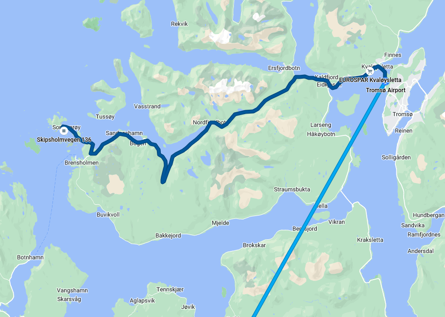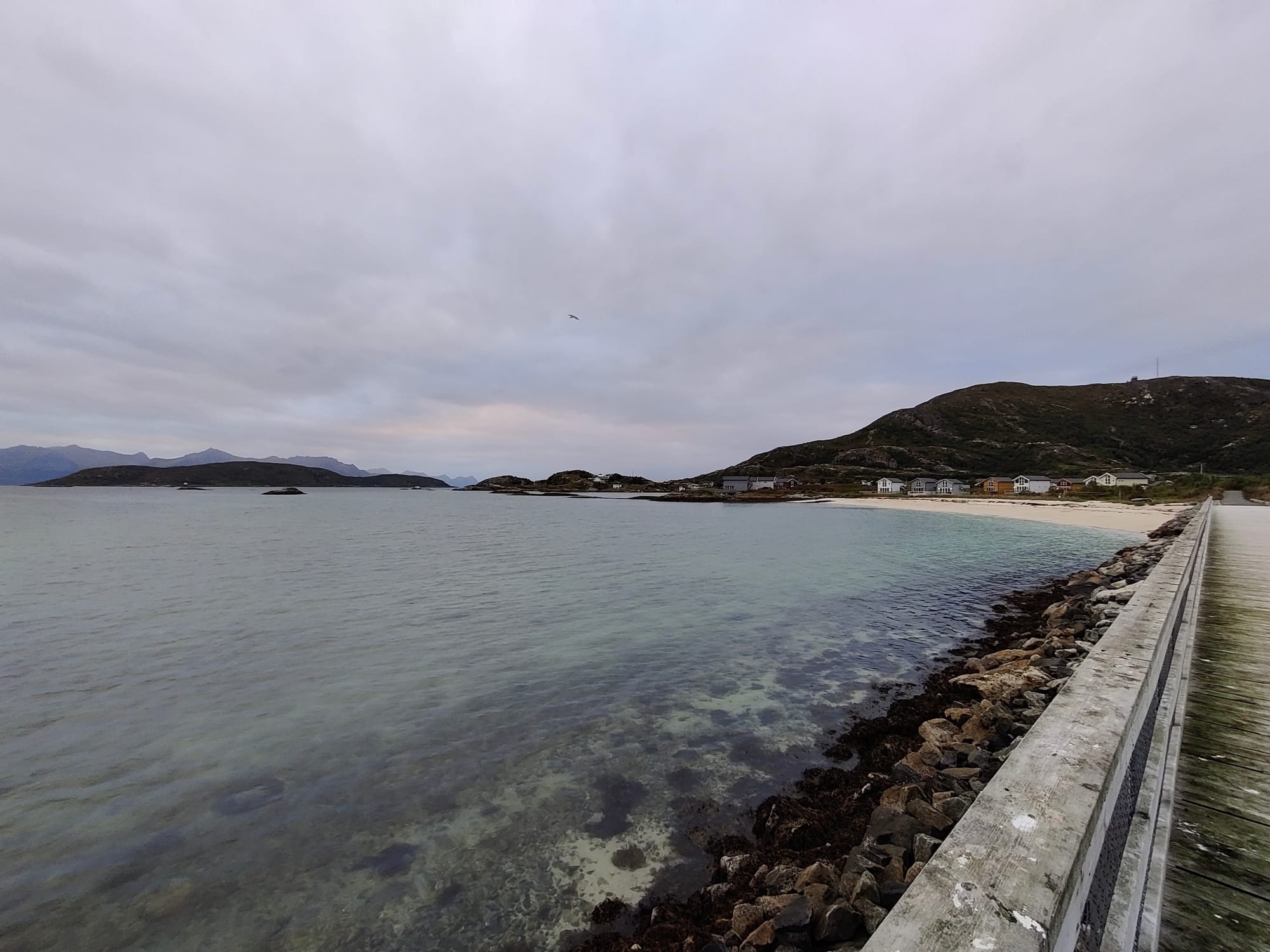 Beim Eurospar auf Kvaløya kaufen wir fürs Abendessen und Frühstück ein und fahren dann langsam die Fjorde entlang zu unserem Tagesziel Sommarøy, wo wir ein Ferienhaus gebucht haben. Trotz des bedeckten Himmels ist die Fahrt der Küste entlang wunderschön und ruhig; der Sommer neigt sich dem Ende zu und Nordnorwegen ist leer geworden.