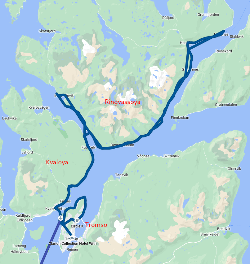 Am nächsten Morgen regnet es tatsächlich Bindfäden, also frühstücken wir in Ruhe, packen unsere Koffer für den Flug um und machen noch eine kleine Ausfahrt nach Kvaløya und Ringvassøya. Die Landschaft dort, die praktisch direkt hinter den Stadtgrenzen wild und ziemlich einsam wird, gefällt uns gut. Wir fahren bis zum Fährhafen noch Langnes, von wo aus man die Fähre nach Karlsøy nehmen kann, und drehen dann um.