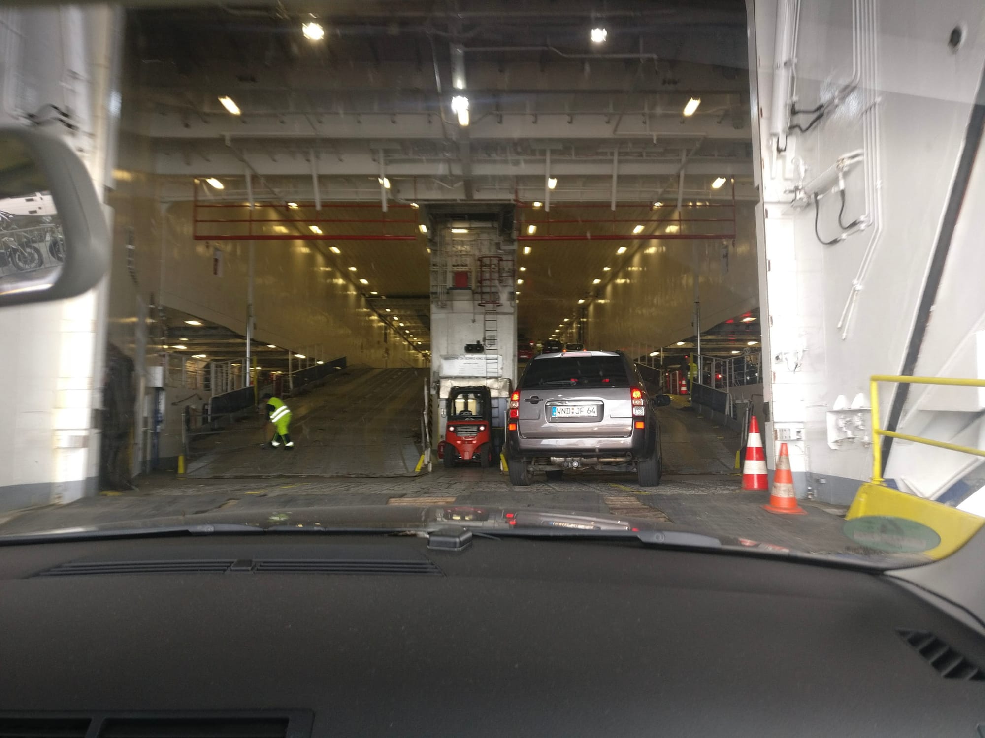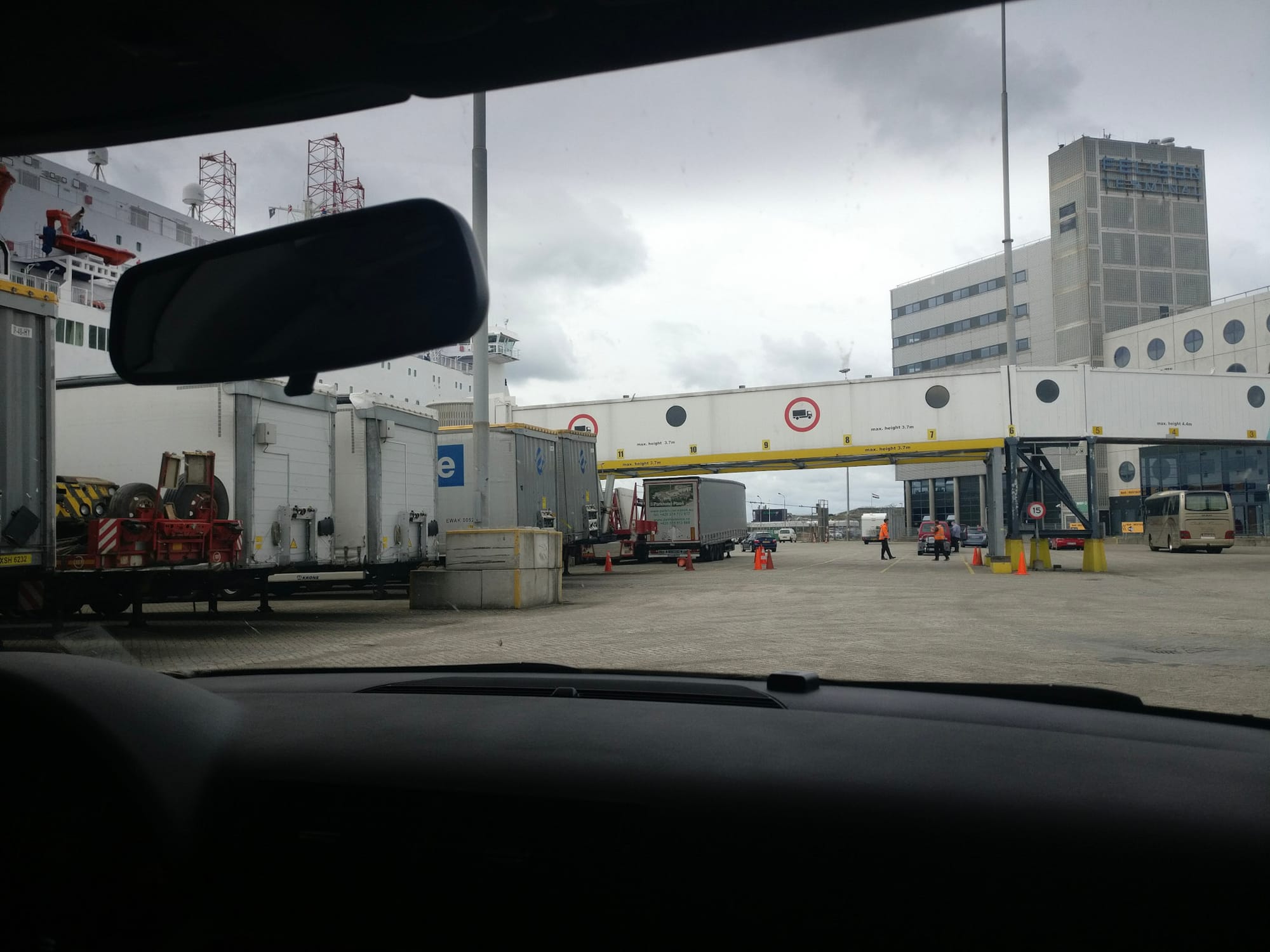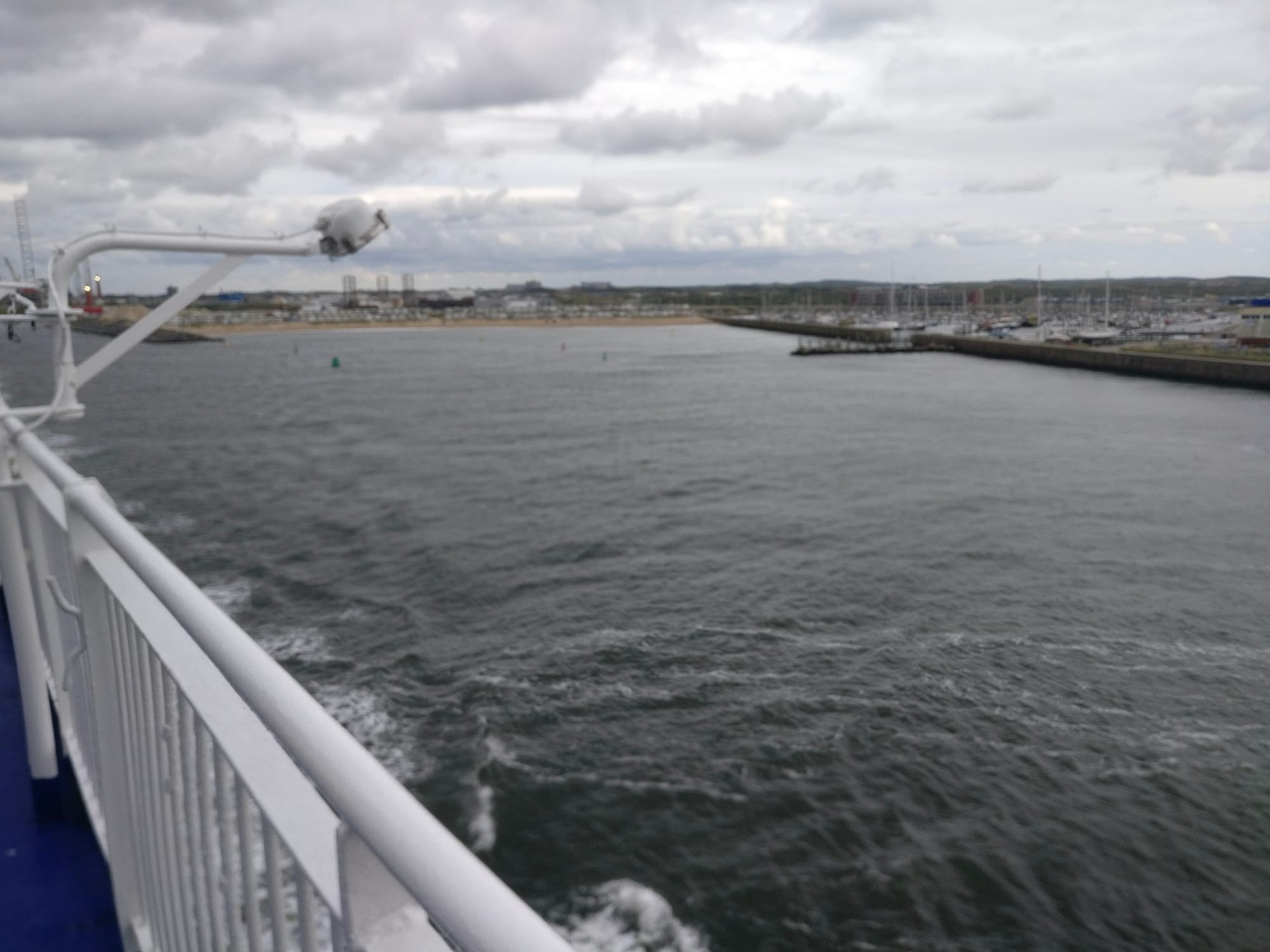 Der Verkehr stellt sich als unproblematisch dar, die Grenze nach Holland ist bald erreicht und auch das “roam like at home” funktioniert unproblematisch - wie angenehm, denn das Gefrickel mit den ausländischen SIM-Karten mochte ich auf den letzten beiden Reisen nie besonders. Am Hafen Ijmuiden hat der Himmel ein liebliches Stahlgrau angenommen, ein frischer Wind weht und da der Umkreis einen eher abgerissenen Charme verströmt, checken wir bereits einige Stunden vor Ankunft auf der Fähre ein und buchen noch ein Abendessen zu. Die “King Seaways” der Reederei DSDF ist ein größerer Kahn, mit Platz für 2280 Menschen und 570 Autos ragt sie 9 Decks hoch in den Himmel. Auch bei dieser Fähre parken die Autos unzeremoniell in langen Reihen im Bauch der Fähre, ohne gesondert gesichert zu werden. Unsere Kabine, eine der einfacheren mit Stockbett, hat immerhin ein Fenster und eine kleine Couch, wo wir ein wenig abhängen, bis es Zeit zum Ablegen ist. Vom Deck aus bietet sich eine gute Aussicht über die Bucht und die bunten Badehäuschen am nahegelegenen und, wenig überraschend, völlig leeren Strand. Kaum ist die Hafeneinfahrt passiert, beginnt das Schiff deutlich spürbar zu schwanken - etwas überraschend, aber mit großem Unterhaltungswert.