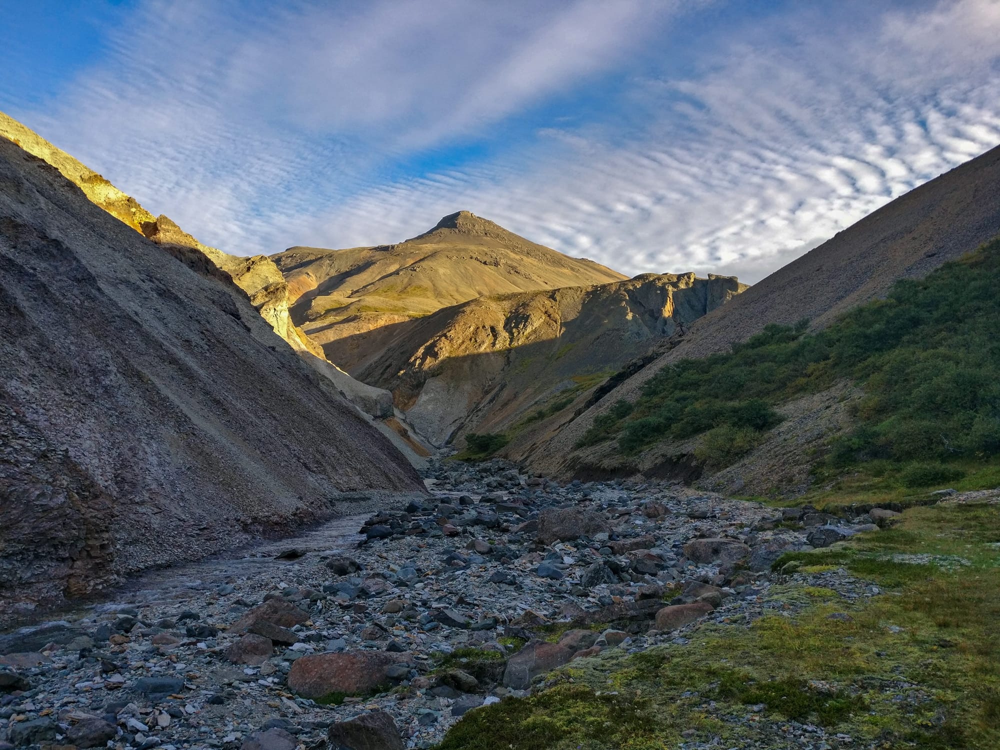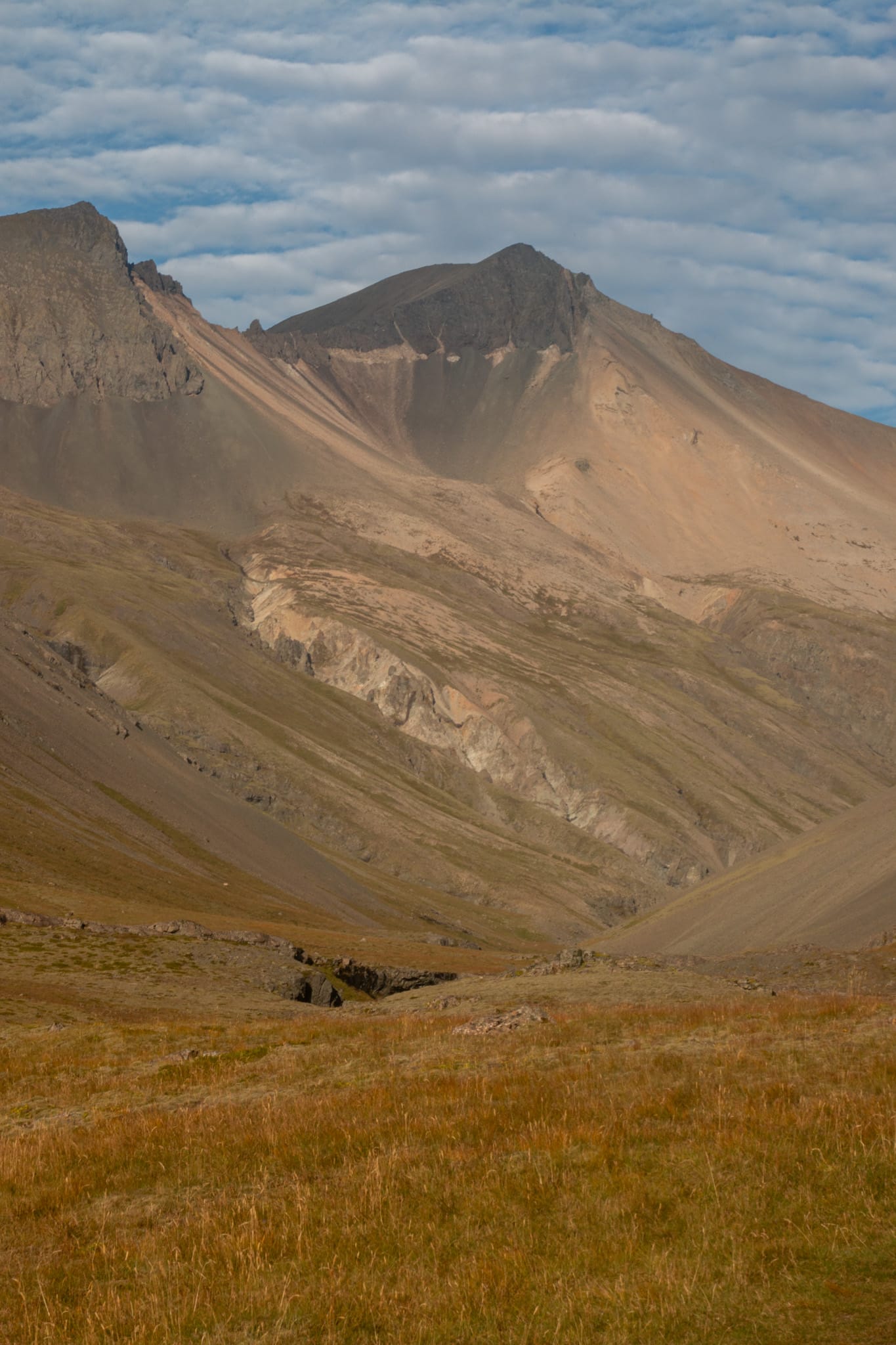 Am nächsten Morgen ist der Himmel blau und bevor wir das Zelt abbrechen, steige ich noch einmal den Weg zum Rand der Schlucht hoch und sehe zu, wie das Sonnenlicht langsam die bunten Geröllhänge hinabwandert. Der Gletscherfluss und das Meer glitzern, als wir der Ringstraße weiter Richtung Höfn folgen. Nach einem kurzen Spaziergang zum Fremstifoss suchen wir die tourist info Höfn auf, werfen einen Blick auf die dortige Ausstellung, von der mir rein gar nichts im Gedächtnis ist, und lassen uns einige Wanderstrecken an den nahen Gletscherzungen vorschlagen. Schon der erste Abzweig, der Hoffellsjökull, ist ein Treffer. An der Gletscherzunge parken wir und unternehmen einen Rundweg über den Gleitafellsbjörg, einen mit Gesträuch und Heide bewachsenen Felskamm, von dem aus man auf den Gletscher hinunterblicken kann, der wie ein breiter eisiger Fluss vor uns ausgebreitet liegt. Es ist sommerlich warm. Auf dem höchsten Punkt führt der Weg vom Gletscher weg in ein Seitental, vorbei an sumpfigen, wollgrasbestandenen Wiesen auf einem abenteuerlichen jeep trail zurück ins Tal. Mittlerweile passe ich auf die Wegmarkierungen auf wie ein Schießhund und prompt bleibt uns der Weg bis zum Schluss erhalten.