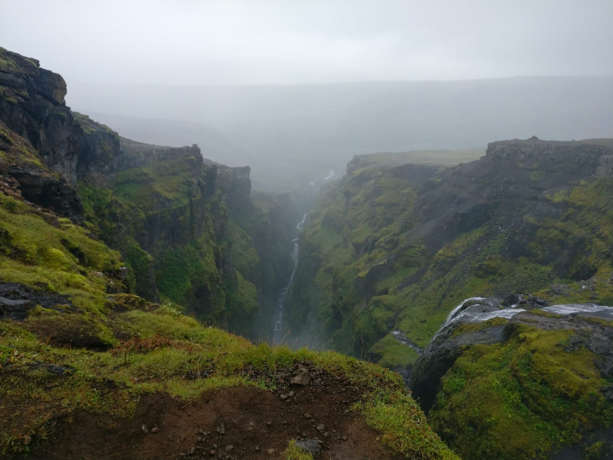 Der Fluss hat reichlich Wasser, ist aber an der Furt nur knietief. Etliche Wanderer vor uns füllen sich die Stiefel randvoll, für uns geht es barfuß über die spitzen Steine, ich jaule, rutsche und bekomme taube Zehen, aber immerhin mit der Gewissheit, den Rückweg in trockenen Schuhen bewältigen zu dürfen. Es geht auf dem Plateau entlang durch mugelige Wiesen, die an Almen erinnern und wenn es weniger regnete, könnte es idyllisch sein. Spätestens an dem Punkt, als der Weg sich im Geröll verliert und kein gangbarer Pfad die steile Wand hinunter auszunehmen ist, ist die gute Laune verflogen und leichte Panik macht sich in mir breit. OSMand kennt einen Pfad, der aber nicht sehr vertrauenerweckend aussieht und ein Übel, das uns später vertraut werden wird, ist uns an diesem Tag noch brandneu: der heimtückisch verschwindende Schafspfad. Wir tapsen über Geröllfelder und durch Birkengestrüpp und ich frage mich, ob wir gleich am ersten Tag zu jenen Touristen gehören sollten, die von einer bescheidenen Anhöhe mit dem Helikopter gerettet werden müssen.