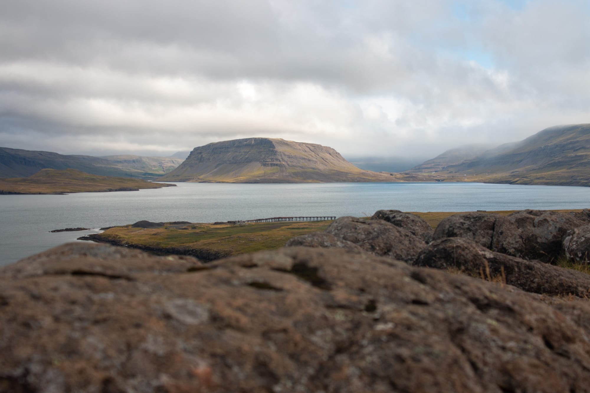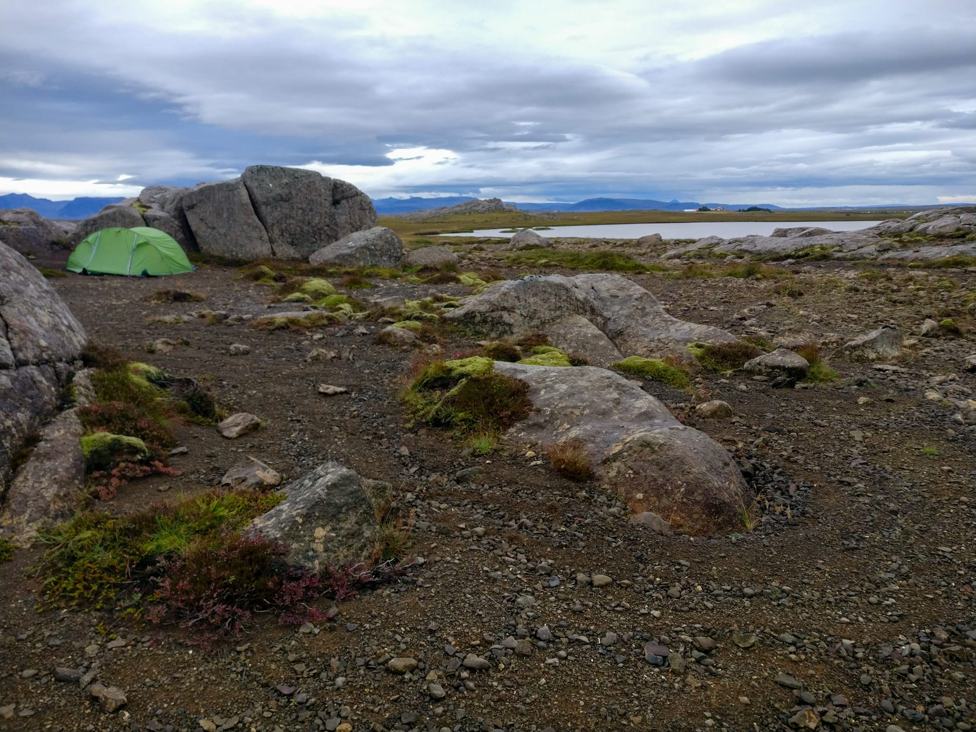 Im grauen, sich dem Ende zuneigenden Nachmittag queren wir den eigentümlich milchigen Borgarfjord, rüsten uns an der Tankstelle mit Gas und einer Daten-SIM aus, die zunächst einige Rätsel aufgibt, und fahren der Küste entlang nach Snaefellsnes auf der Suche nach einem Zeltplatz. Die Landschaft ist flach und alles eigentümlich grau in dem trüben Licht, Wiesen, von unzähligen Flüssen und eigentümlichen Felszungen durchzogen, sie erinnert uns an die Landschaft, durch welche die Orcs Merry und Pippin geschleift haben. Auf einer Kiesfläche inmitten eines solchen Lavaflusses werden wir fündig, liegen erstmalig im fabrikneuen Zelt, darunter das um nichts ältere Tarp.