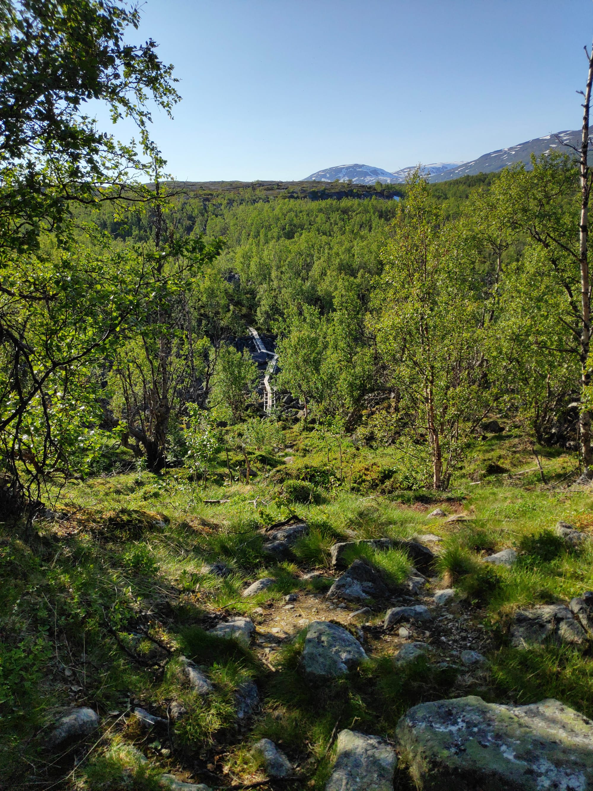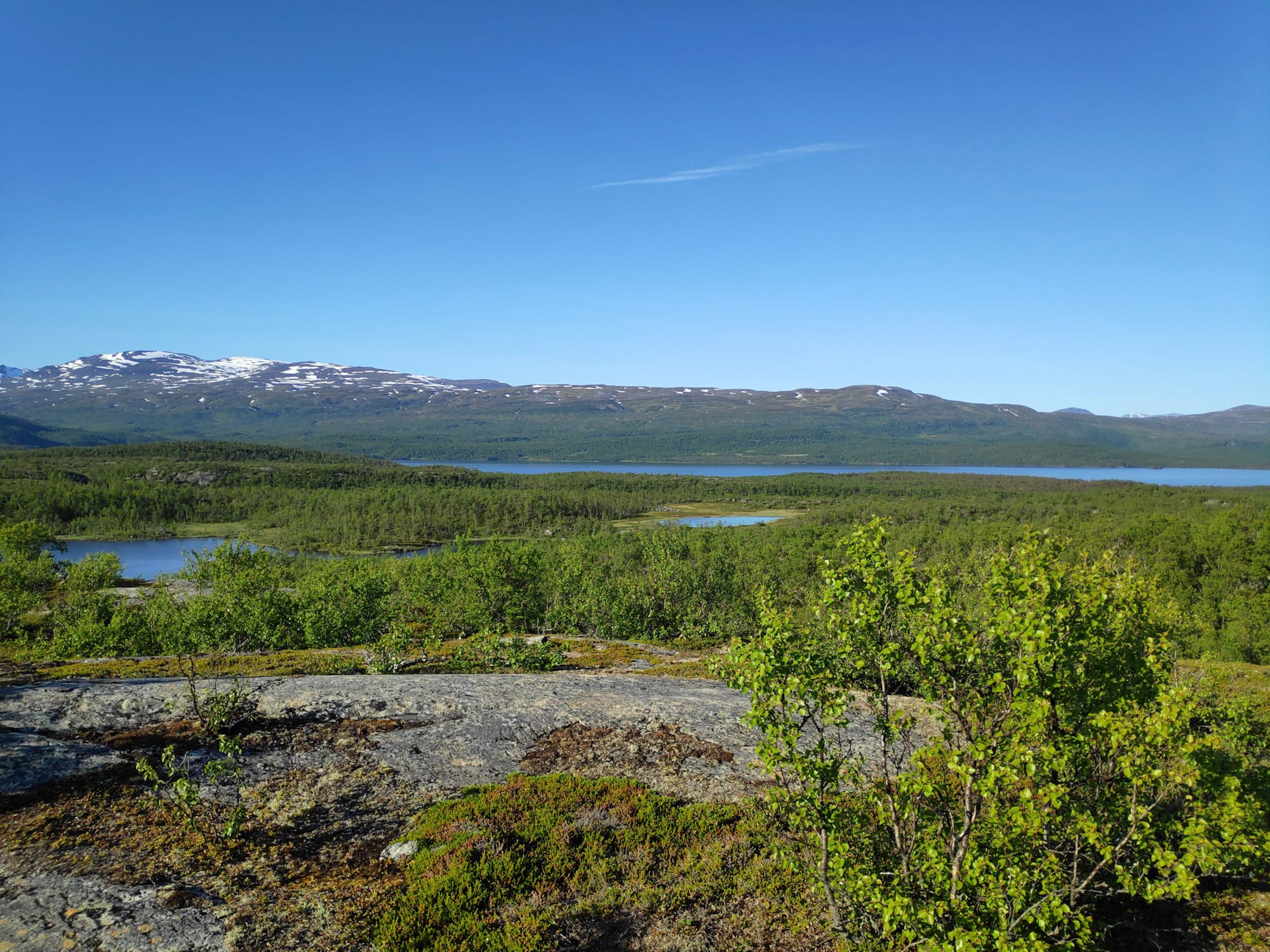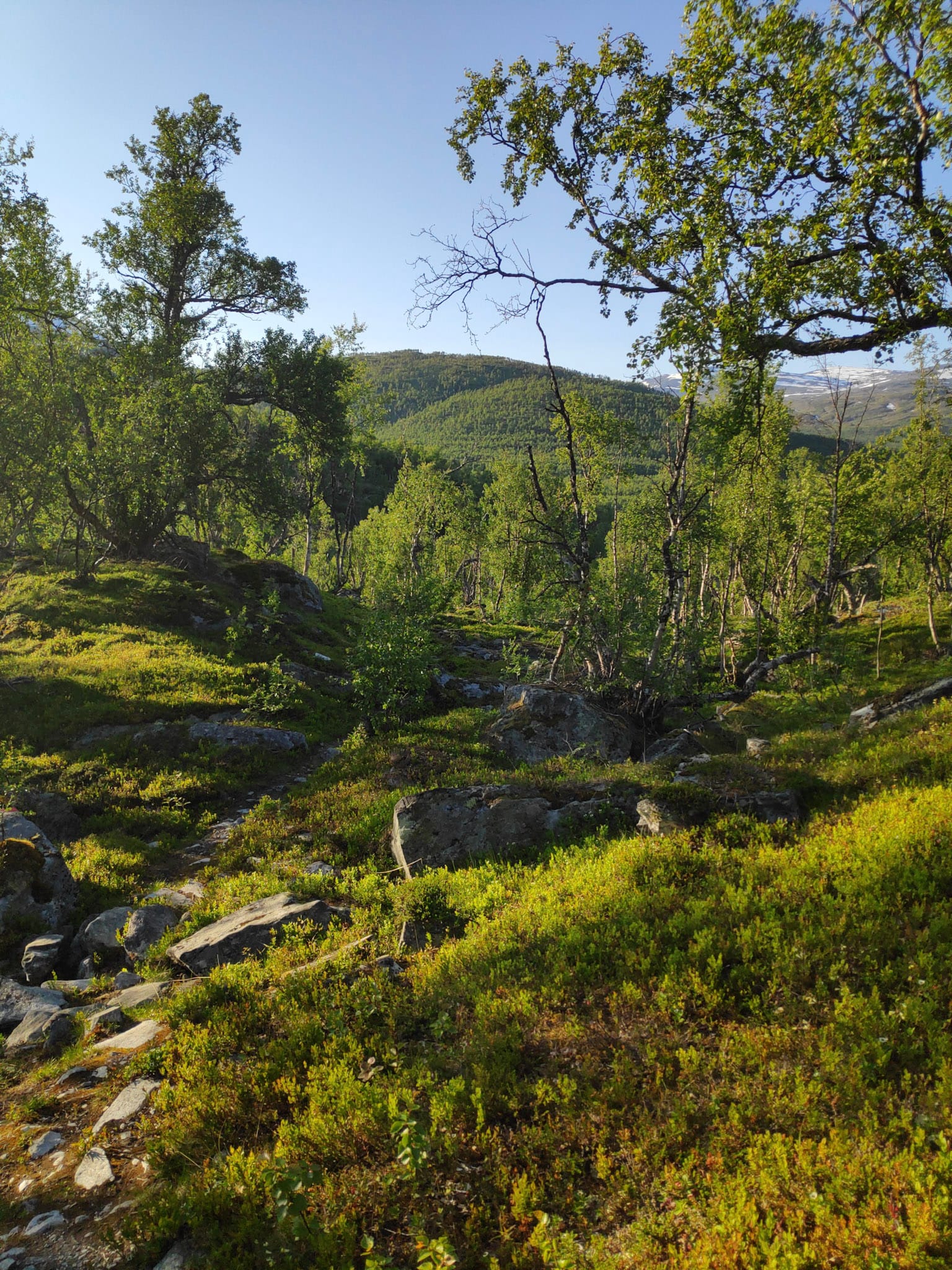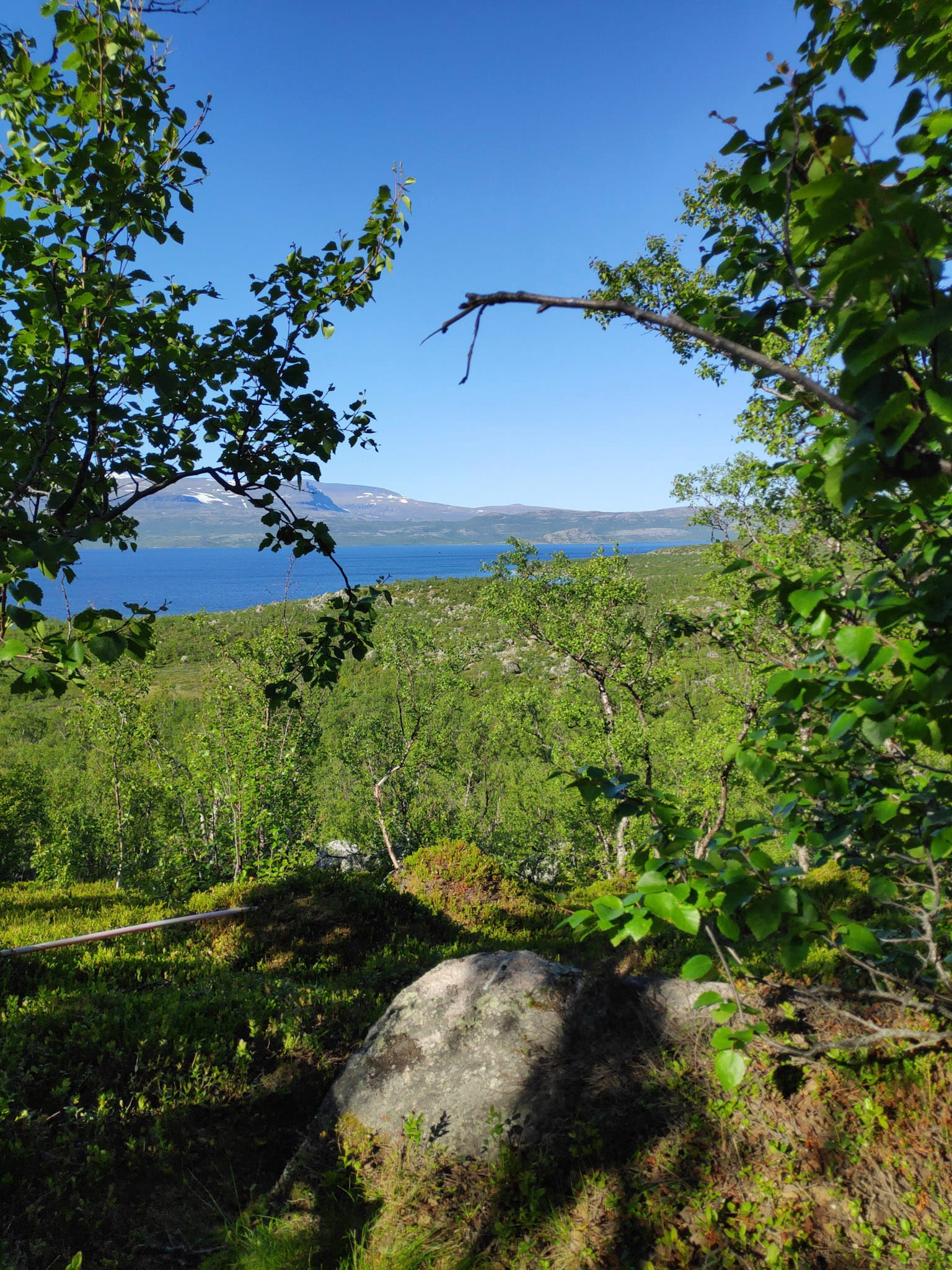 Schon nach ein paar hundert Metern schwitze ich gehörig, der sicherheitshalber angezogene Hoodie ist viel zu warm und muss runter. Mit dem dünnen longsleeve geht es besser, auch wenn durchaus noch weniger Klamotte gegangen wäre - zumindest haben so die Mücken weniger Chancen. Ich schwitze gehörig, die Sonne wärmt kräftig und es weht kaum ein Lüftchen. Das Gelände wird hügeliger und es geht für kurze Strecken durchaus steil hinauf und hinab, wobei die Anhöhen immerhin die Chance auf eine kleine Brise bieten. Insgesamt ist das ganz schön anstrengend, noch stimmt nichts, die Schuhe sind nicht gut genug geschnürt, das Tempo ist zu schnell, das Terrain völlig unvertraut und zuviel unnützer Krempel im Rucksack. Die Kilometeranzeige auf Heikos Apple Watch ist auch nicht gerade dazu angetan, einem Auftrieb zu geben, wir kommen echt eher langsam voran, nicht zuletzt dank diverser Foto- und Wunderstops - immer wieder haben wir wundervolle Aussichten ins Tal hinein, sehen den Torneträsk in der Ferne aufblitzen und die Berge langsam aber sicher näherkommen. In der anderen Richtung fällt uns ein merkwürdiges Tal auf, wie ein flaches “U” ist es aus den Bergen geschnitten - ja logisch, das Lapporten! So sehen wir es doch noch, herzlichen Glückwunsch. Manchmal kann man sich nur an den Kopf fassen, gern mehrfach, das vertreibt auch die Mücken.