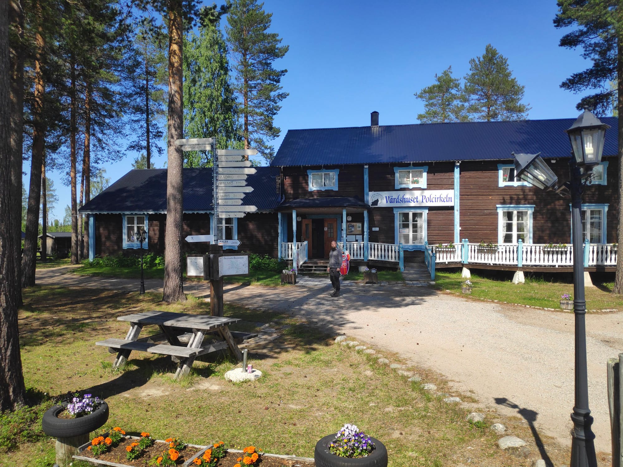 Bei der ersten Tankstelle an der E10 tanken wir noch einmal voll und ich klemme mich wieder für ein Weilchen hinters Steuer. Der Nachmittag kommt und neigt sich, es geht stetig nach Nordwesten und irgendwann, recht unscheinbar, ein Rastplatz: Polcirkeln, der Polarkreis. Mittlerweile fährt H. wieder, fährt erst vorbei und muss wenden, so viel Zeit muss sein. Wir machen ein Foto am Schild, genießen die Sonne und die warme Nachmittagsluft. Die Wälder werden immer niedriger und die Straßengräben sind voll bunter Blumen. Nach einer Pinkelpause frage ich H. nach der Beschaffenheit des Waldbodens zwecks Zeltaufschlagen, sein Urteil: hervorragend, Krähenbeerenheide und dickes Moos.
