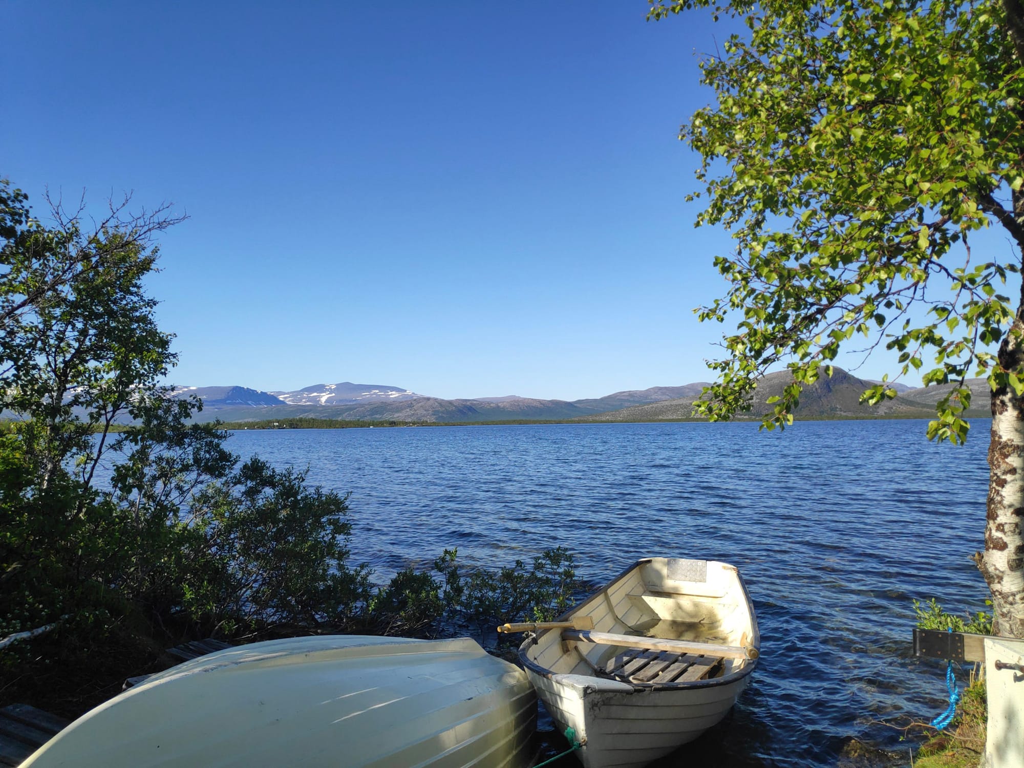 In der Palnostugan-Hütte liegt schon ein schwedischer Wanderer in einem der Stockbetten, der, soweit wir uns verständlich machen können, in Gegenrichtung unterwegs ist - da er aber fast kein Englisch spricht, ist die Konversation recht schnell zu Ende und wir wünschen ihm eine gute Nacht. Hinter der Hütte gibt es ein ebenes Stück Wiese und eine Feuerstelle, wir entdecken nach kurzem Umschauen jedoch noch ein weiteres Wiesenstück fast direkt am See mit Zugang zu einem Kiesstrand, wo wir inmitten bunter Blumen unser Zelt aufstellen - zum ersten Mal in der Geschichte dieses Zelts mit offenem Außenzelt und hervorragender Aussicht.