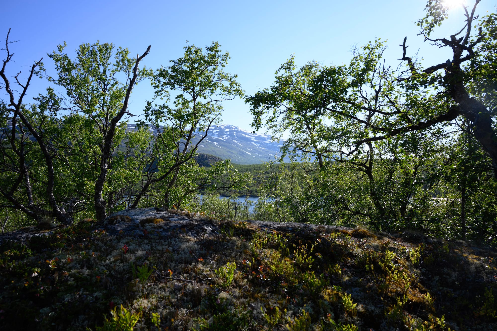 Der Wanderweg ist hervorragend markiert und auch ohne Markierungen gut erkennbar. Es geht direkt sehr abwechslungsreich los mit einer Mischung aus Pfad und Bohlenwegen, die sumpfige Stellen überbrücken - ich bin entzückt, hatte ich doch schon so oft Bilder von schwedischen Bohlenwegen gesehen und nun darf ich sie selber unter die Füße nehmen! Diese Begeisterung für Bohlenwege lässt später merklich nach, denn es gibt sie reichlich, mir wird klar, dass diese der Grund dafür sind, dass der Pfad auf den Satellitenbildern so gut zu erkennen ist. Links und rechts des Weges leuchtet das tiefe Grün der Heide vor Blumen, von den zartweißen Blüten des schwedischen Hartriegels über riesige, wildrosenähnliche Moltebeerenblüten, oberschenkelhohe Trollblumen und bunten Storchenschnabel ist alles dabei - ein Rausch. Auch dabei: Mücken, vor allem, wenn man mal stehenbleibt. Noch hilft Wedeln.