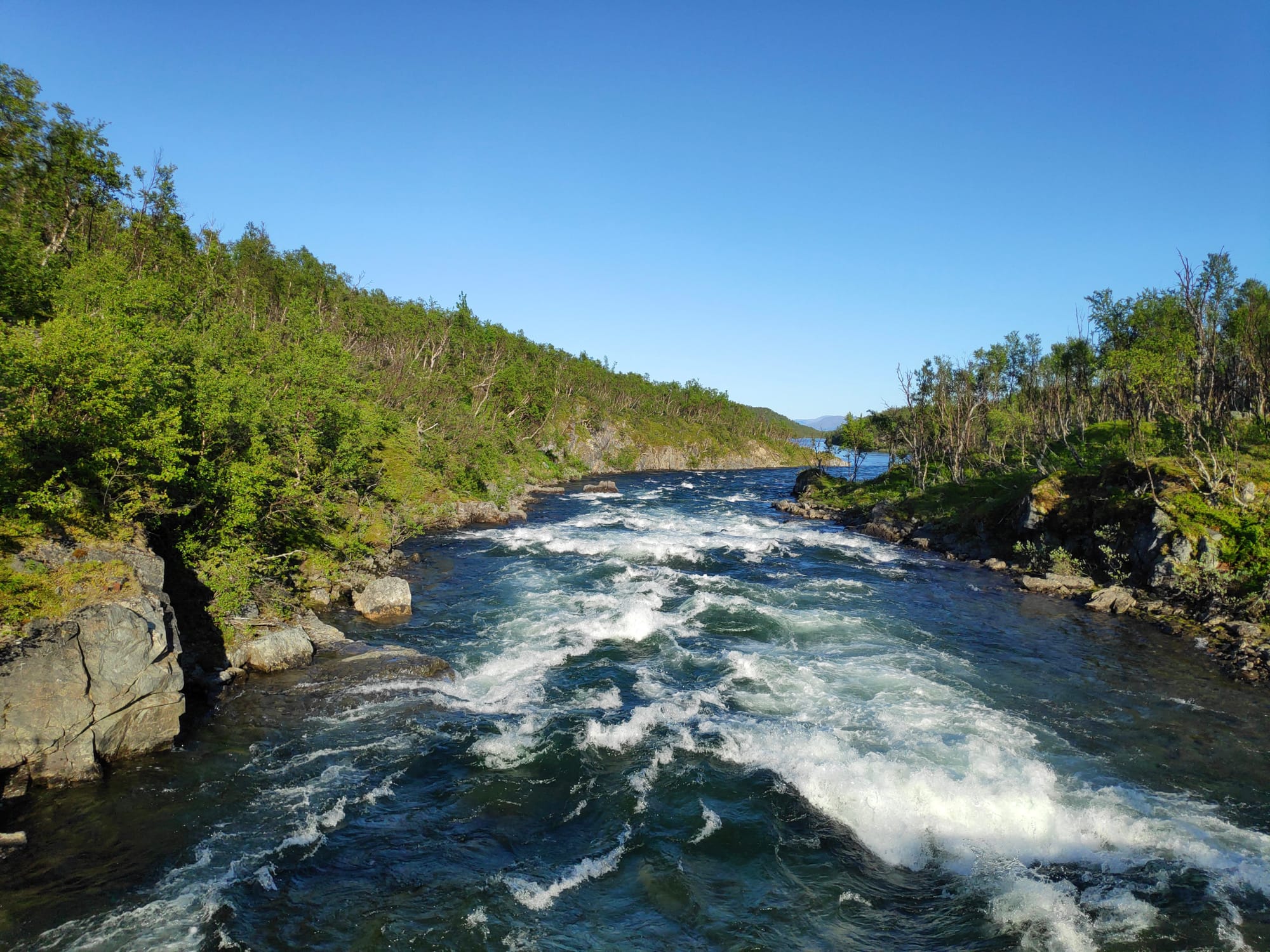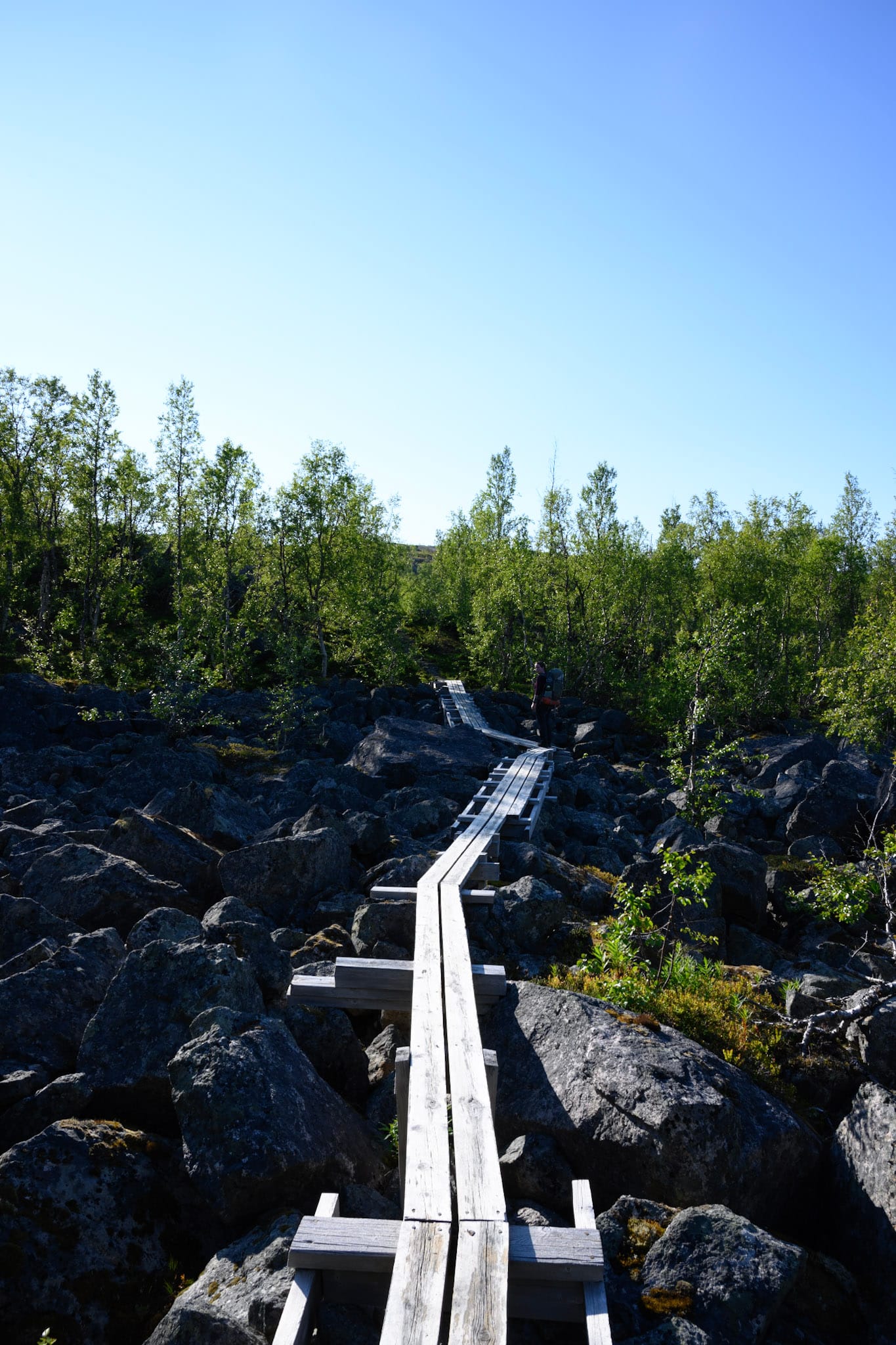 Einmal passieren wir auf gleicher Höhe, nur in hundert Metern sicherer Entfernung hinter einer sumpfigen Senke gelegen, ein Schneefeld, im nächsten Tal wird ein langes Blockfeld durch einen Bohlenweg überbrückt. Ich habe etwas Respekt vor der Angelegenheit und tapse unbeholfen über die Planken, die im übrigen ziemlich schief stehen, aber die Gewöhnung hilft. Auf der nächsten Hügelkuppe hören wir plötzlich einen Fluss rauschen, das muss der Njuorajokk sein, der durch eine Stahlhängebrücke gequert wird; beim Abstieg kommt uns ein Angler, allerdings ohne Fang, entgegen.
