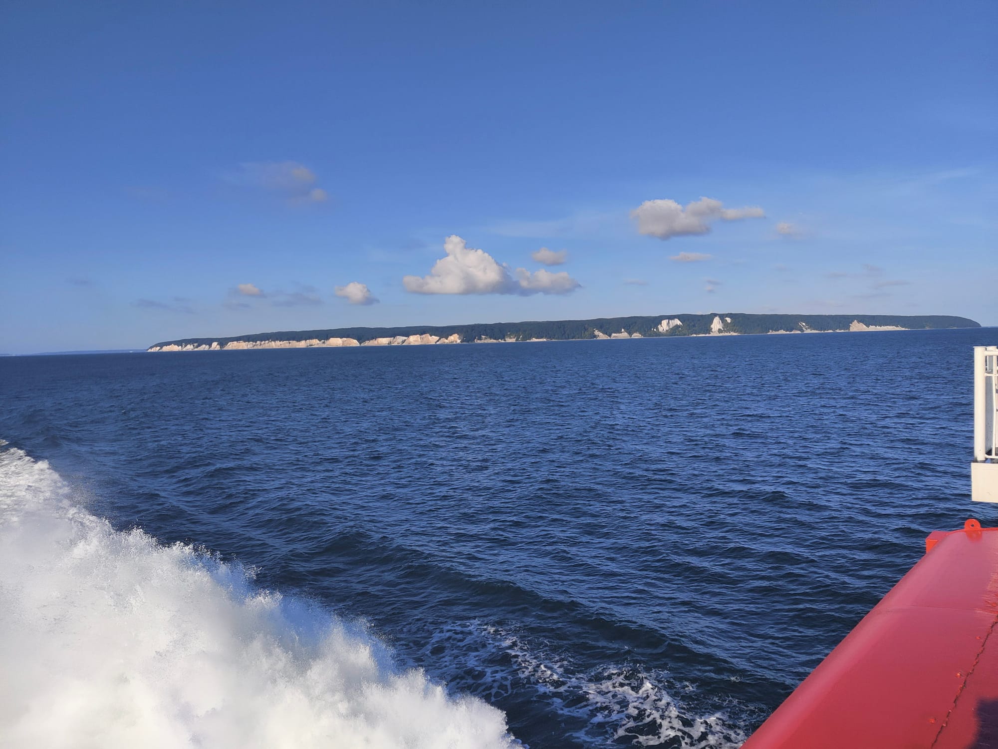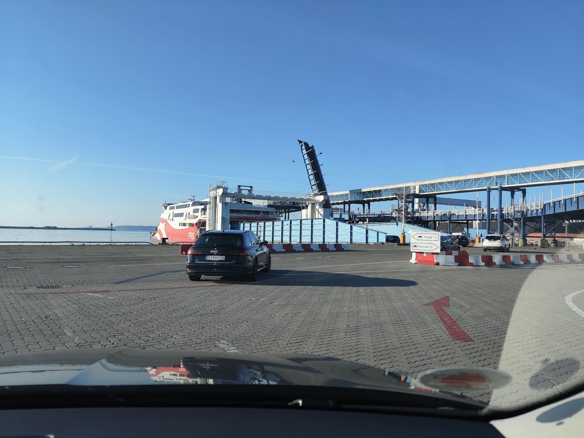 Am Sonntag heißt es gegen halb sechs dann aufstehen und nach Verabschiedung durch Heikos Eltern fahren wir im schönsten Frühmorgenlicht nach Stralsund und quer über die Insel Rügen zum Fährhafen. Wir sind diesmal erst um zwanzig nach sieben da, was dazu führt, dass wir nach nur wenigen Minuten Wartezeit schon aufs Schiff können. Das Ablegen verfolgen wir vom Außendeck, ziehen uns dann in die Sessel zurück und ich verbringe den Rest der Fahrt mit Musik hören und stricken.